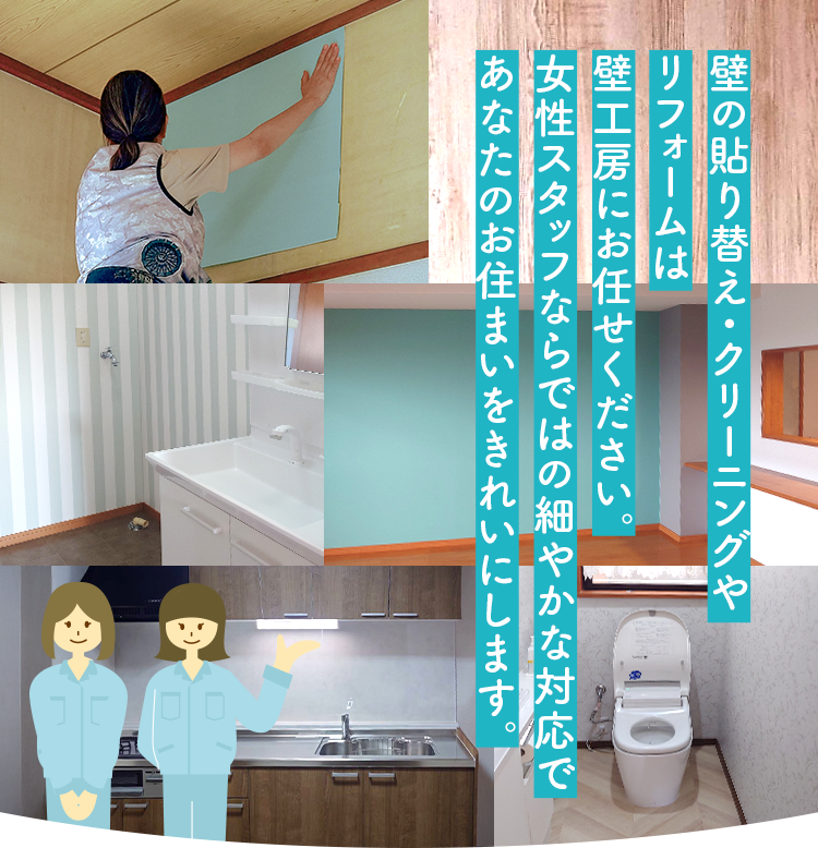 壁工房熊本は熊本市内を中心に住宅、マンション、店舗、事務所などの壁紙・クロス張り替え、壁紙原状回復施工、内装リフォーム工事を手掛ける専門店。あなたの健やかな暮らしの実現をお手伝いします。